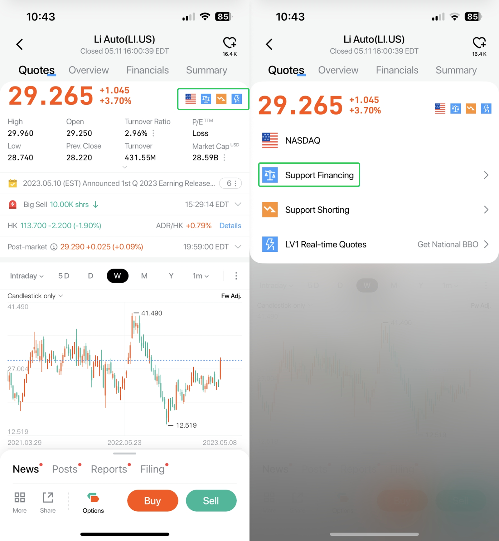 Not all stocks support intraday financing trade. If you want to check whether individual stocks support intraday financing trade, you can click to choose Longbridge App > Intraday Financing Account > Stock > Support Financing (view the figure below). For a list of eligible stocks for intraday financing trade, please click this link.