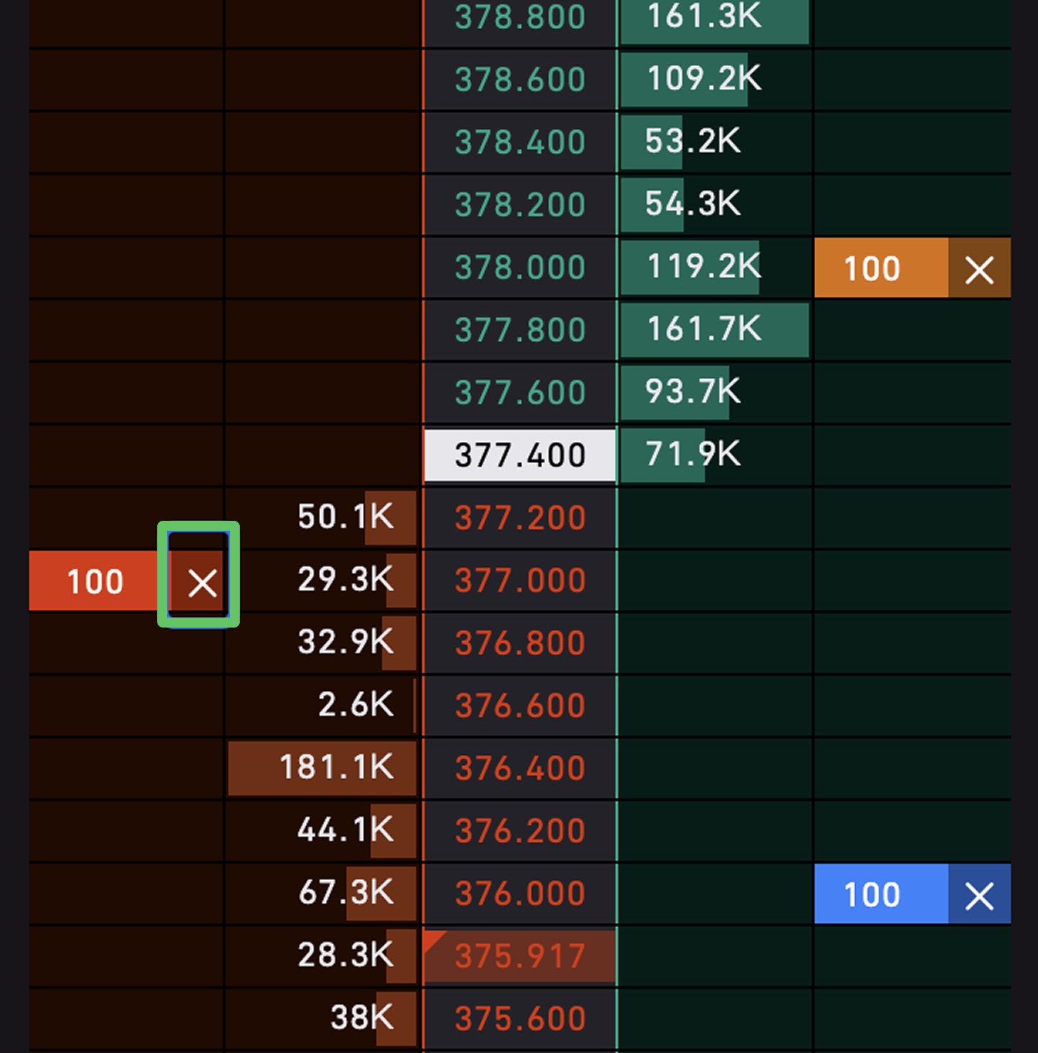 You can click to place an order directly at the desired price on the market depth board. After placing the order, the corresponding order quantity will be displayed.